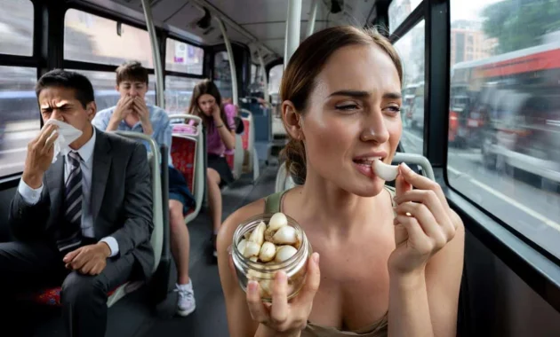 The first raw garlic clove cracked between the woman’s teeth with an audible crunch. Within seconds, the pungent aroma began spreading through the enclosed bus like an invisible fog. Maria watched fellow passengers cover their noses, crack windows despite the cold morning air, and shoot irritated glances toward the garlic-eating woman who seemed completely oblivious to the chaos she was creating.