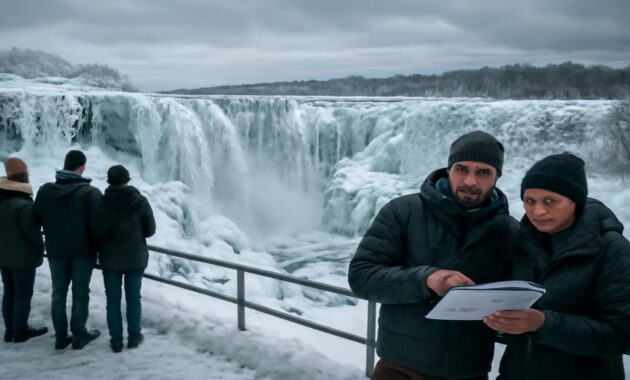 Visitors to the iconic landmark stand in awe, their breaths forming delicate plumes that dissipate into the stillness. The falls, usually a roaring symbol of nature’s power, have been tamed by the unforgiving embrace of the arctic temperatures, transforming the landscape into a realm of ice and snow.