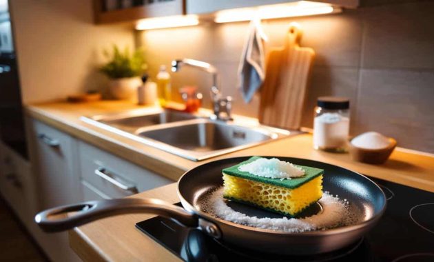 Right after you finish the dishes, you dry your sponge, wring it as much as you can, then place it on a very warm surface for a few minutes: near a hot pan off the heat, on a warm stovetop, or in a clean, dry pan that you briefly warmed. Then, while it’s still warm, you sprinkle it generously with coarse salt.