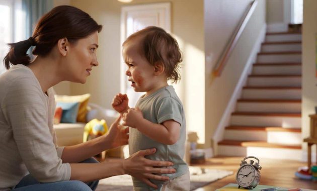 The little boy is sitting on the bottom stair, cheeks still wet, legs swinging in the air. His mother stands a few feet away, arms crossed, trying not to look at him. Kitchen timer ticking. Thirty more seconds of “time-out.”