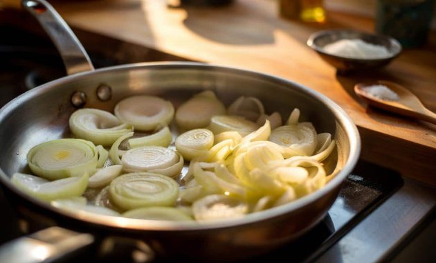 The pan is quiet at first, a gentle shimmer of oil and a small pile of pale onion crescents resting there, unsure of what’s to come. But as the minutes tick by, the air starts to fill with a captivating aroma. Slowly, the onions begin to transform, their edges turning golden-brown and their centers softening into a luscious, sweet base.