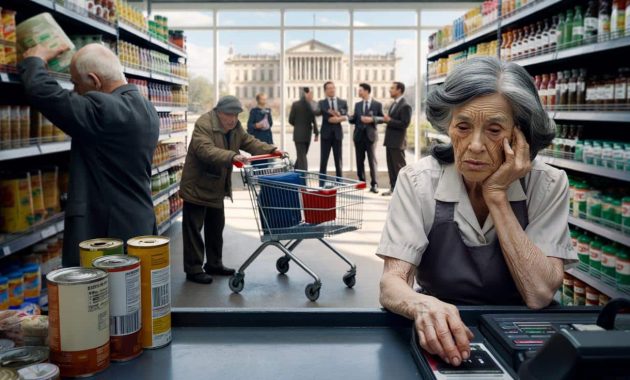 She scans another pack of pasta, smiles at a crying toddler, and glances at the clock. Two more hours to go before she can go home, eat a cheap soup, and calculate again how long her savings will last.